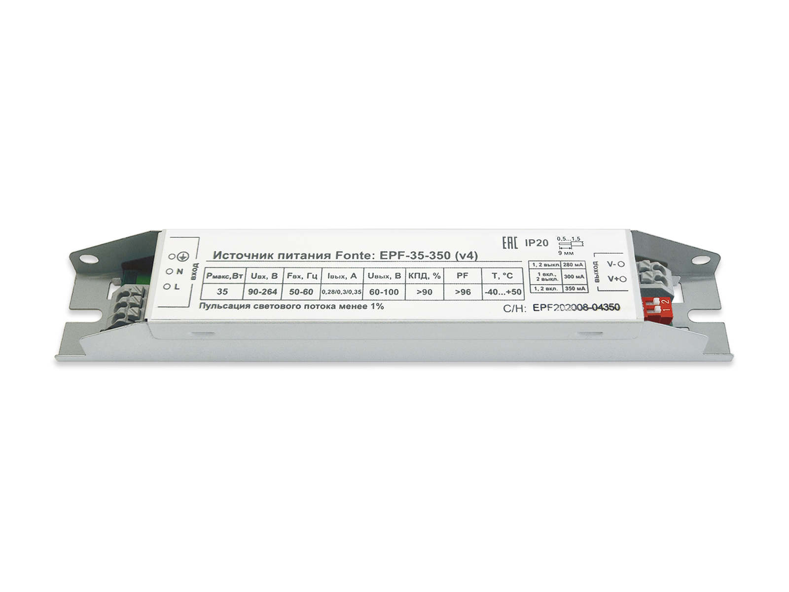 | Выходной ток, мА | 280; 300; 350 (дискретно при помощи переключателя на плате) |