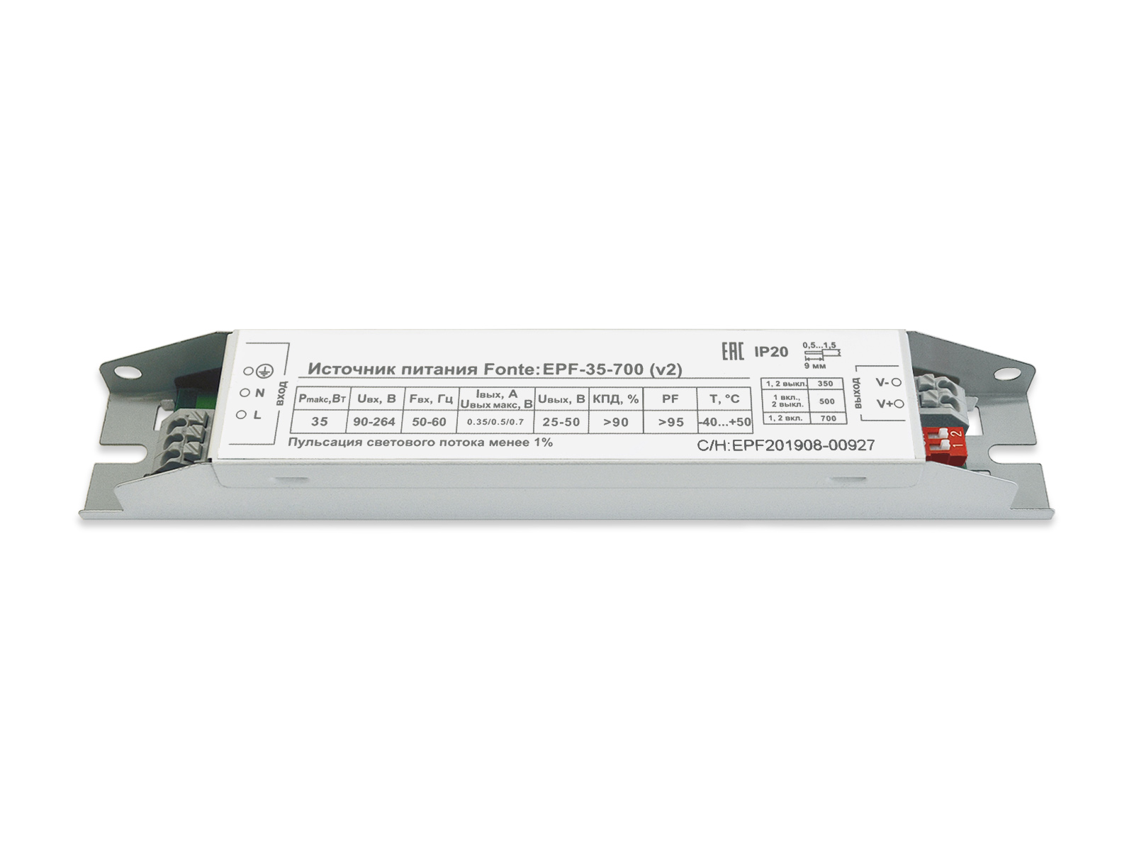 | Выходной ток, мА | 350; 500; 700 (дискретно при помощи переключателя на плате) |