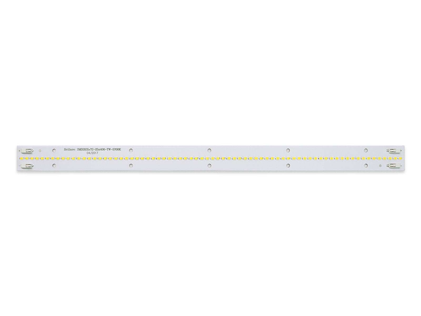 Светодиодный модуль Brillare: SMD2835*72-400х25-TW состоит из печатной платы на алюминиевой подложке, клеммных колодок и светодиодов, используется в составе осветительного оборудования в качестве источника света. На обратную сторону модуля может быть нанесена полоса теплопроводящей клейкой ленты, что обеспечивает хороший отвод тепла от светодиодов. Светодиодный модуль имеет 10 монтажных отверстий с диаметром 3,6 мм для крепления к корпусу светильника или рабочей поверхности. Для быстрого и безопасного монтажа рекомендуется использовать пластиковые заклепки. В случае использования металлических заклепок рекомендуется использовать изолирующие шайбы, которые препятствуют повреждению изолирующего слоя светодиодного модуля и токоведущих дорожек. Распределение светодиодов обеспечивает равномерное свечение по всей площади модуля. Светодиодные модули Brillare могут комплектоваться с источниками питания ТМ D-Luce, получая в итоге полноценный комплект для переоснащения/модернизации светильников с люминесцентными лампами, а также для производства новых светодиодных светильников.