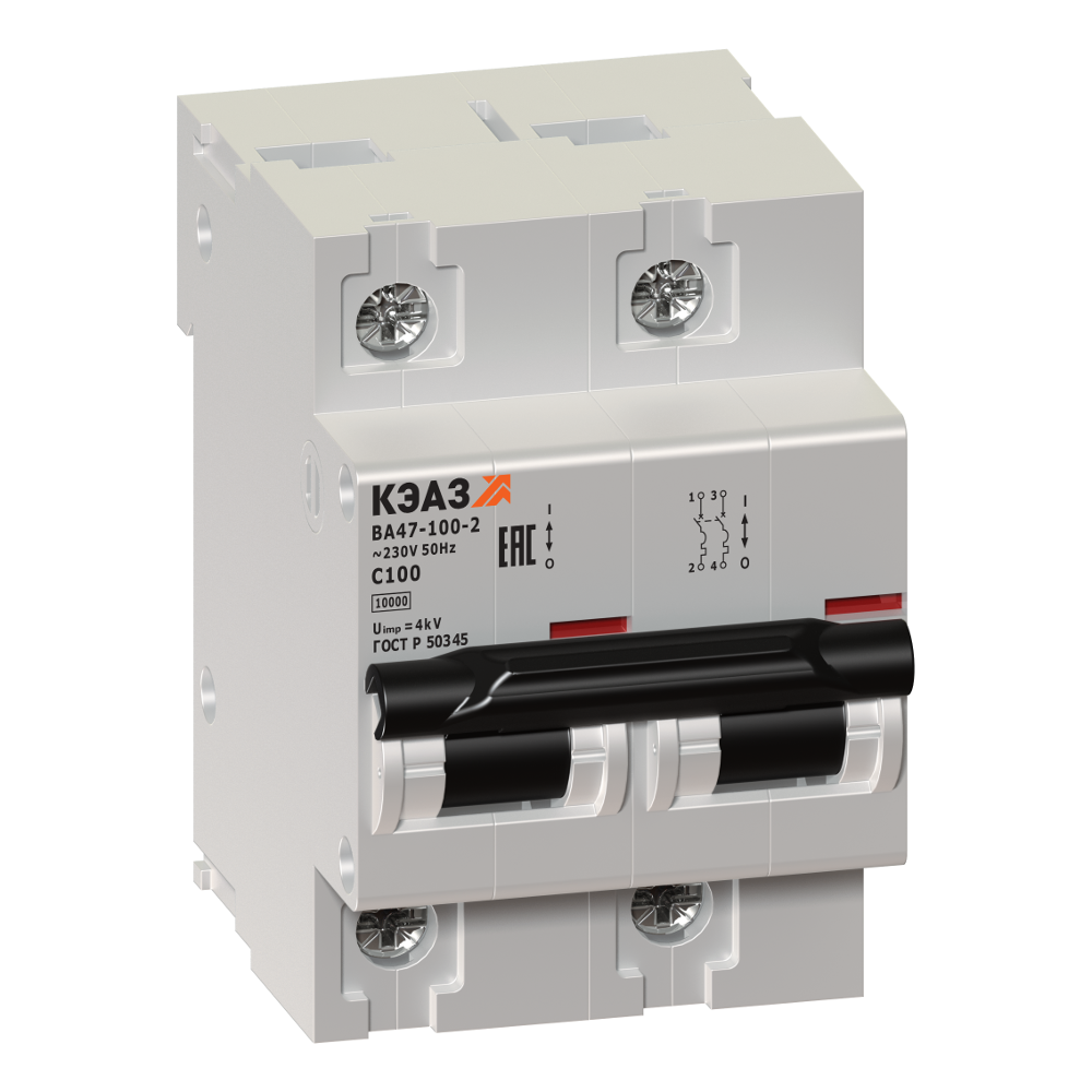 Модульный автоматический 2 полюсный выключатель переменного тока с предельной коммутационной способностью при переменном токе 10 кА на номинальный ток 32 А.