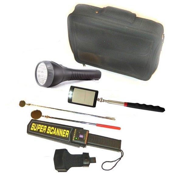Комплект КОНДОР - фонарь, металлоискатель, 3 досмотровых зеркала. Металлодетектор: -15...+50 °С, питание-батарея 9 В "Крона", дальность обнаружения металлических объектов: игла швейная – 4 см, монета 1 руб – 6 см, пистолет ПМ – 25 см, 50 часов непрерывной работы, 410х80х30 мм, 300 гр. Досмотровое зеркало: 8х5,5 см, выдвижная штанга 17...80 см, регулируемый угол крепление зеркала, питание 2хCR2032. Досмотровое круглое сферическое зеркало D 5 см, выдвижная штанга 17...40 см, регулируемый угол крепление зеркала, питание 2хCR2032. Досмотровое круглое сферическое зеркало D 3 см, выдвижная штанга 10...40 см, регулируемый угол крепление зеркала. Светодидный фонарь с аккумулятором и встроенным зарядным устройством от сети 220 В.