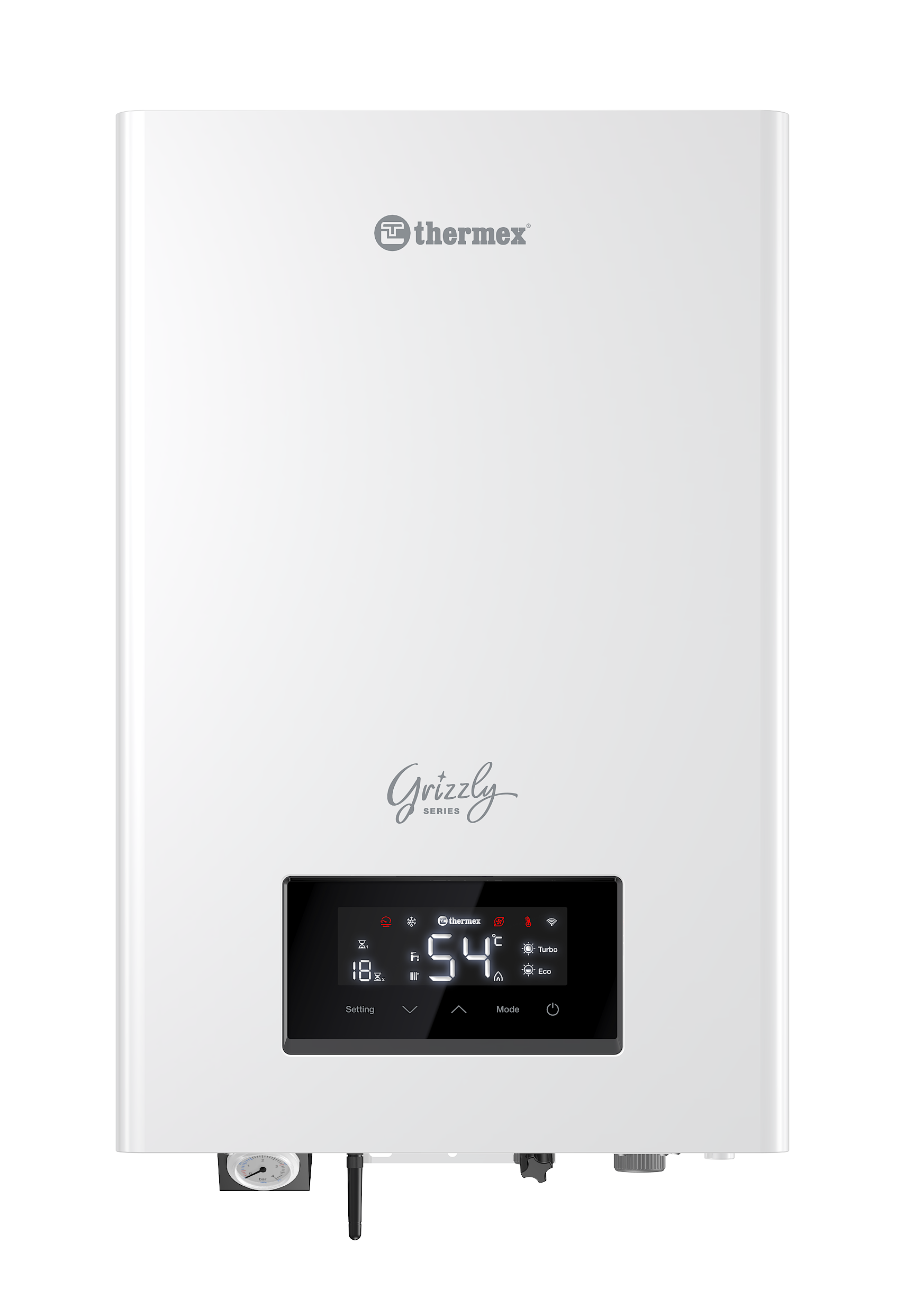 Thermex (Термекс) Grizzly 5-12 Wi-Fi имеет удобное электронное управление с дисплеем. Посредством него можно изменять рабочие режимы (выбрать Turbo, Comfort или Eco), а также осуществлять регулировку температуры термоносителя в линии циркуляции.