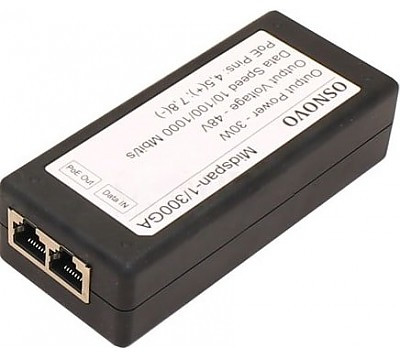 Midspan-1/300GA PoE-инжектор. Мощность PoE - до 30Вт. Напряжение PoE - 48В. (конт. 4,5 (+); 7,8 (-)), Gigabit Ethernet. Совместим с оборудованием PoE IEEE 802.3af/at. Порты: вх. - RJ45 (GE, 10/100/1000 Base-T), вых. - RJ45(GE + PoE); 100-240AC В; 150x38x65 мм; -10 ... +50 °C