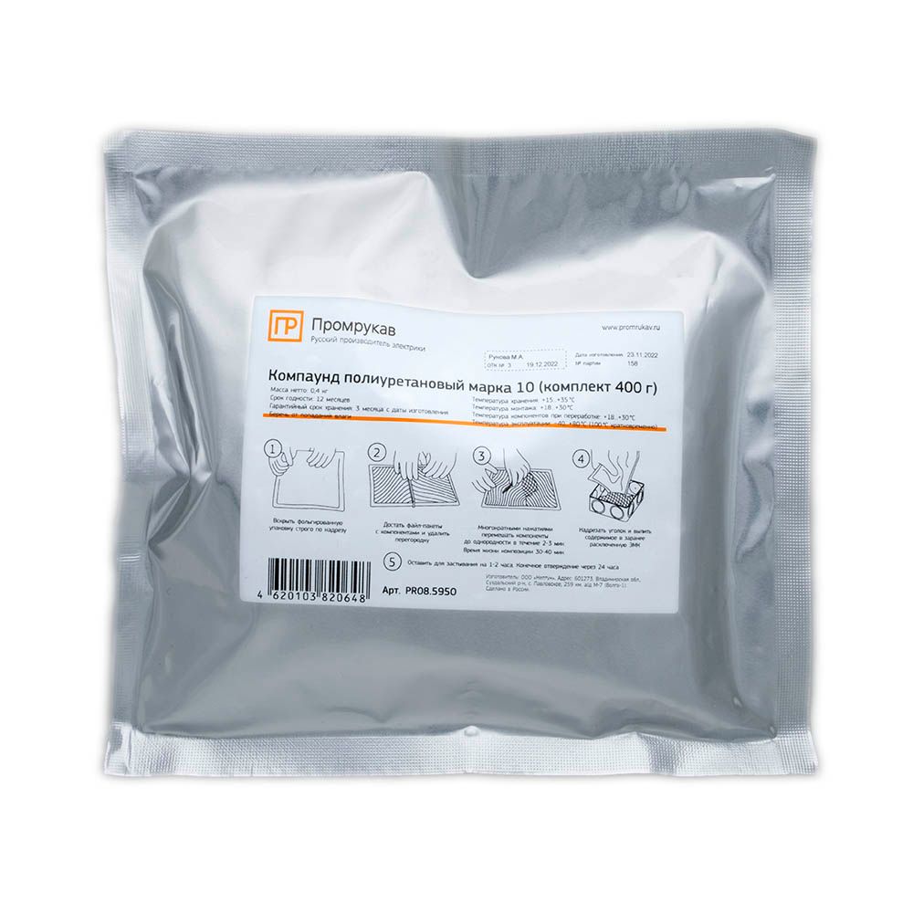 Компаунд PR08.5950 полиуретановый, электроизоляционный, марка 10, 400 г Двухкомпонентный полиуретановый компаунд предназначен для герметизации, электроизоляции и механической защиты кабельных соединений в ЭМК, кабельных муфтах и кабельных проходах. Обладает необходимым сочетанием физико-механических и электроизоляционных характеристик. Рекомендуется использование при монтаже распределительных двухкомпонентных ЭМК, двухкомпонентных коробок под видеокамеру. Объем одной упаковки компаунда (400 г) позволяет заполнить ЭМК 70*70*40 мм, 80*80*40 мм и 100*100*50 мм. Для заполнения коробки 70*50 мм потребуется 140 г компаунда.Для заполнения коробки 70*70*40 мм потребуется 200 г компаунда. Для заполнения коробки 80*80*40 мм потребуется 260-300 г компаунда. Для заполнения коробки 100*100*50 мм потребуется 450-500 г компаунда.