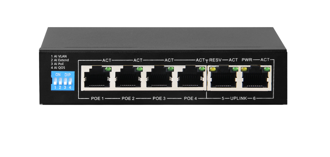 Коммутатор сетевой 6-портовый интеллектуальный, 4 PoE порта (PoE IEEE 802.3af/at), до30 Вт на порт, бюджет PoE 60Вт, дальность передачи питания до 250м, 4 режима работы (AI VLAN, AI Extend, AI Power, AI QoS)