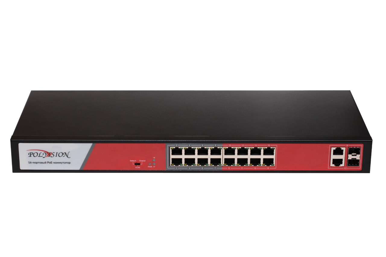 Коммутатор сетевой 18-портовый неуправляемый с PoE, 16 портов 10/100 Мбит/с PoE, 2 порта 10/100/1000 Мбит/с, 2 gigabit SFP порта, до 30 Вт на порт, бюджет PoE 250Вт, крепление у 19" стойку, дальность передачи питания до 250м, пропускная способность 7,2 Гбит/с; 4 режима работы: AI VLAN, AI Extend, AI PoE, AI QOS; 0...+40°C; 440 × 180 × 44 мм.