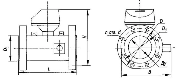 Обозначение исполнения счетчика | Ду, мм | D | D1 | D2 | d/n | L | H | B |