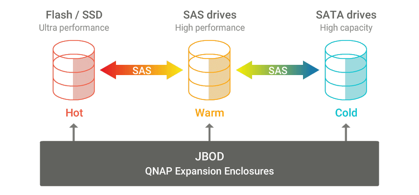 TS-873AU поддерживает SSD-кэширование, которое повышает производительность для приложений требовательных к показателям IOPS, таких как виртуализация. А технология Qtier™ автоматически распределяет наиболее востребованные данных между 3,5-дюймовыми жесткими дисками большего объема и быстрыми 2,5-дюймовыми SSD или модулями M.2 SSD. В Qtier™ 2.0 реализовано резервирование пространства на высокоскоростных SSD дисках, подобное кэш-памяти, для обработки пакетного ввода-вывода в реальном времени, что значительно увеличивает производительность системы.