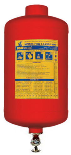 Модуль порошкового пожаротушения МИГ является самосрабатывающим устройством. Запорно-пусковое устройство оснащено тепловым замком,как у спринклера, который в зависимости от исполнения имеет различную температуру срабатывания (+68 ºС, +93 ºС, +141 ºС), и цвет. При воздействии на тепловой замок предельно заданной температуры более одной минуты происходит его разрушение и срабатывание модуля - выброс огнетушащего порошка продолжительностью не более пятнадцати секунд. Модули рассчитаны на различную площадь тушения очага возгорания, в зависимости от объема огнетушащего средства и класса пожара. Технические характеристики подвесных модулей МПП 7 МИГ