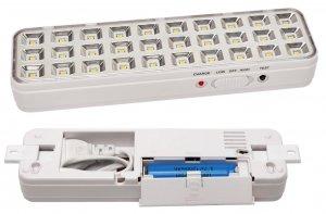 Светильник аварийного освещения светодиодный с выбором режима свечения: постоянный или непостоянный; 30 светодиодов, световой поток 80 Лм; U-пит.187...242В, 1 Li-ion аккумулятор 3.7 В, 1200 мАч, время свечения - до 3 часов; t-раб.0...+40°С, 202х55х30 мм, 0.17 кг
