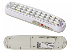 Светильник аварийного освещения светодиодный непостоянного действия; 30 SMD светодиодов, мощность источника света 1.5 Вт, световой поток 80 Лм; U-пит.187...242В, P-потр.0.6 Вт, встроенный Li-ion АКБ 3.7В, емкостью 1200 мАч, защита аккумулятора от глубокого разряда и перезаряда, время свечения - до 6 часов; t-раб.0...+40°С, 270х68х55мм , 0.39кг