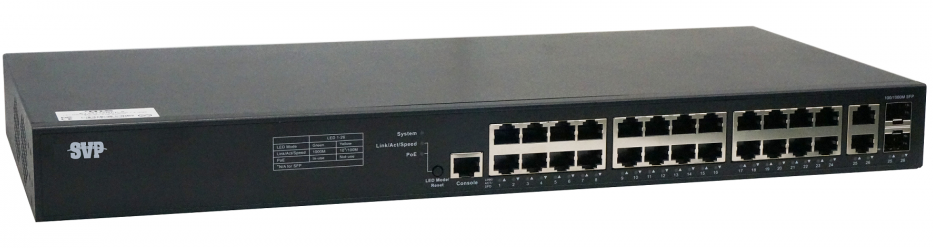 Коммутатор  управляемый Gigabit Ethernet на 26 портов. 24xGE (10/100/1000Base-TX) + 2xCombo GE/SFP (1000Base). Поддержка STP/RSTP/MSTP, Jumbo-кадр 9 Кбайт, IGMP v1 /v2/v3. Console порт.  Питание AC 100-240В. 442x211x44мм; 0…+50°С.