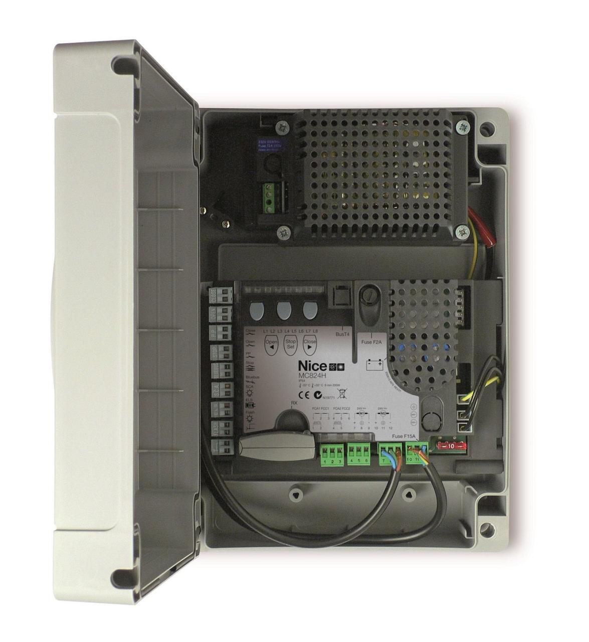 Блок управления для 2-х электроприводов 24 В (двустворчатые распашные ворота), режим самообучения, токовая защита, режим калитки, регулировка скорости открывания, плавный старт и остановка, возможно подключение АКБ PS324, разъем для подключения к системе Solemyo, система BlueBUS