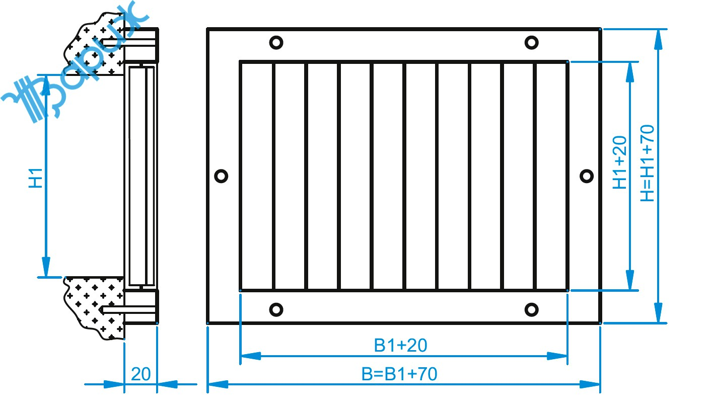 Накладные регулируемые РН3Н решетки монтируются непосредственно на воздуховоды либо строительные проемы без углубления внутрь проема. Это облегчает подбор и монтаж решеток при отклонении размеров проёма в стене от проектных. Не рекомендуется монтаж на транзитных участках воздуховодов.