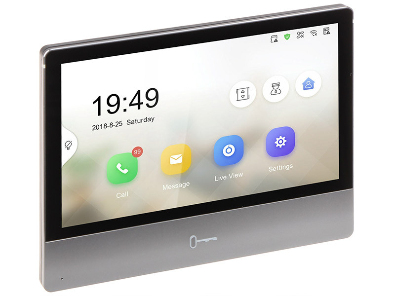 7“ IP видеодомофон цветной IPS LCD экран с разрешением 1024*600; сенсорные кнопки; встроенные микрофон и динамик; слот для TF карты до 32 Гб; тревожные входы/выходы 8/2; 1 RS-485; 1 RJ-45 10M/100M Ethernet; DC 12 В/PoE; 10 Вт; -10...+55 °C; размер 195.8×132.8×17.5 мм