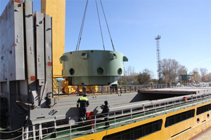 Высота этой крупногабаритной металлической конструкции в собранном виде составляет 14 м, диаметр - 6,5 м, масса - около 750 т. При отгрузке для частей фермы-консоли была применена консервационная упаковка, которая обеспечит сохранность изделия как при транспортировке, так и при длительном хранении на строительной площадке. С завода крупные тяжеловесные узлы оборудования автомобильным транспортом доставили на Волгодонский спецпричал и погрузили на грузовое судно.