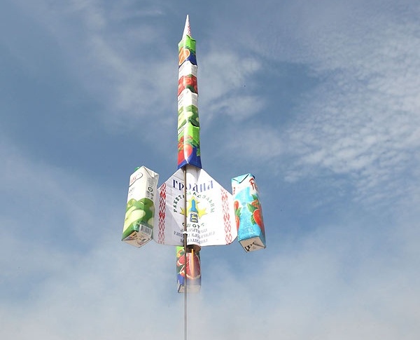 Корпус этих ракет полностью собран из пачек и банок от напитков. Этот запуск был приурочен ко Дню изобретателя и рационализатора и происходил на территории средней школы №38 г. Гродно.