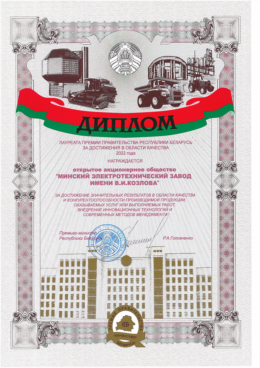 Сегодня генеральному директору ОАО “МЭТЗ ИМ. В.И.КОЗЛОВА” Александру Радевичу вручили Премию Правительства Республики Беларусь за достижения в области качества. Александр Радевич удостоен нагрудного знака “Лидер качества”.